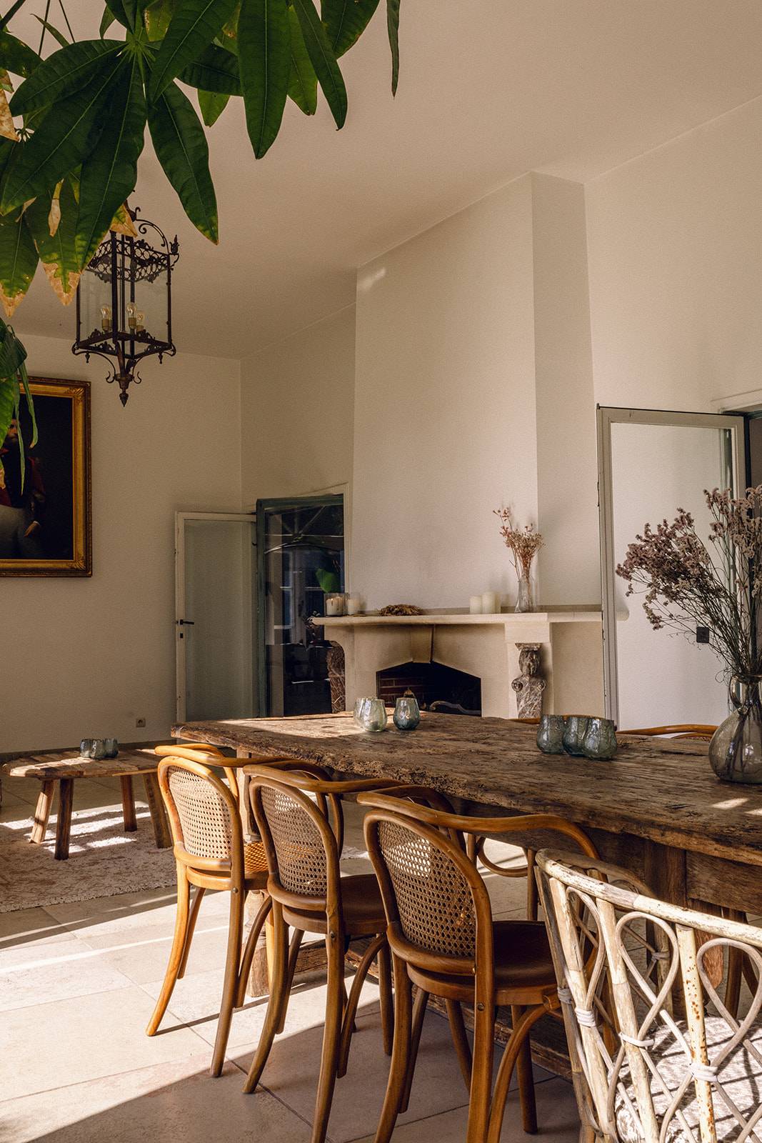 Visgraatparket, antieken spiegels en dubbele deuren. Rotan, linnen en bananenplanten, blending seamlessly in één en dezelfde ruimte.